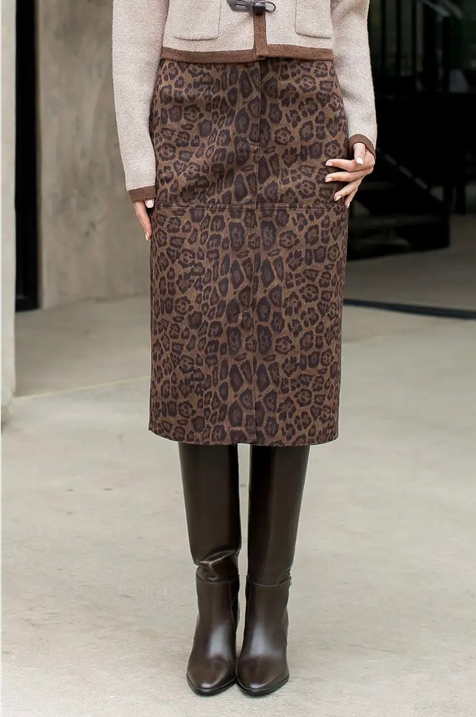 Leopard Print Suede Midi Skirt