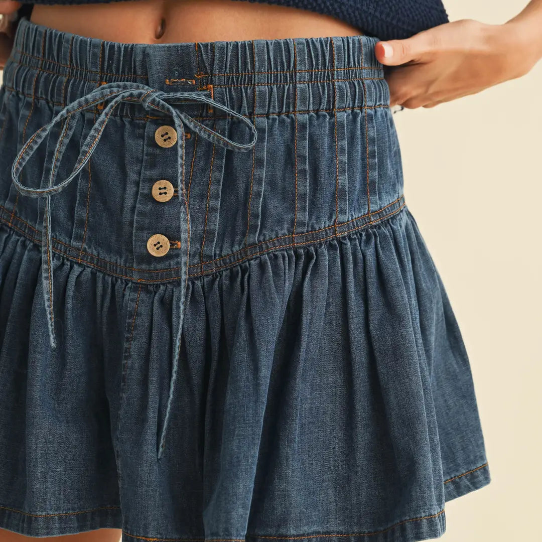Denim Pintuck Detailed Flare Mini Skirt - Small is backordered and will ship as soon as it is back in stock.