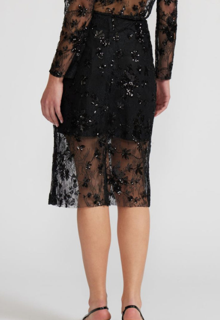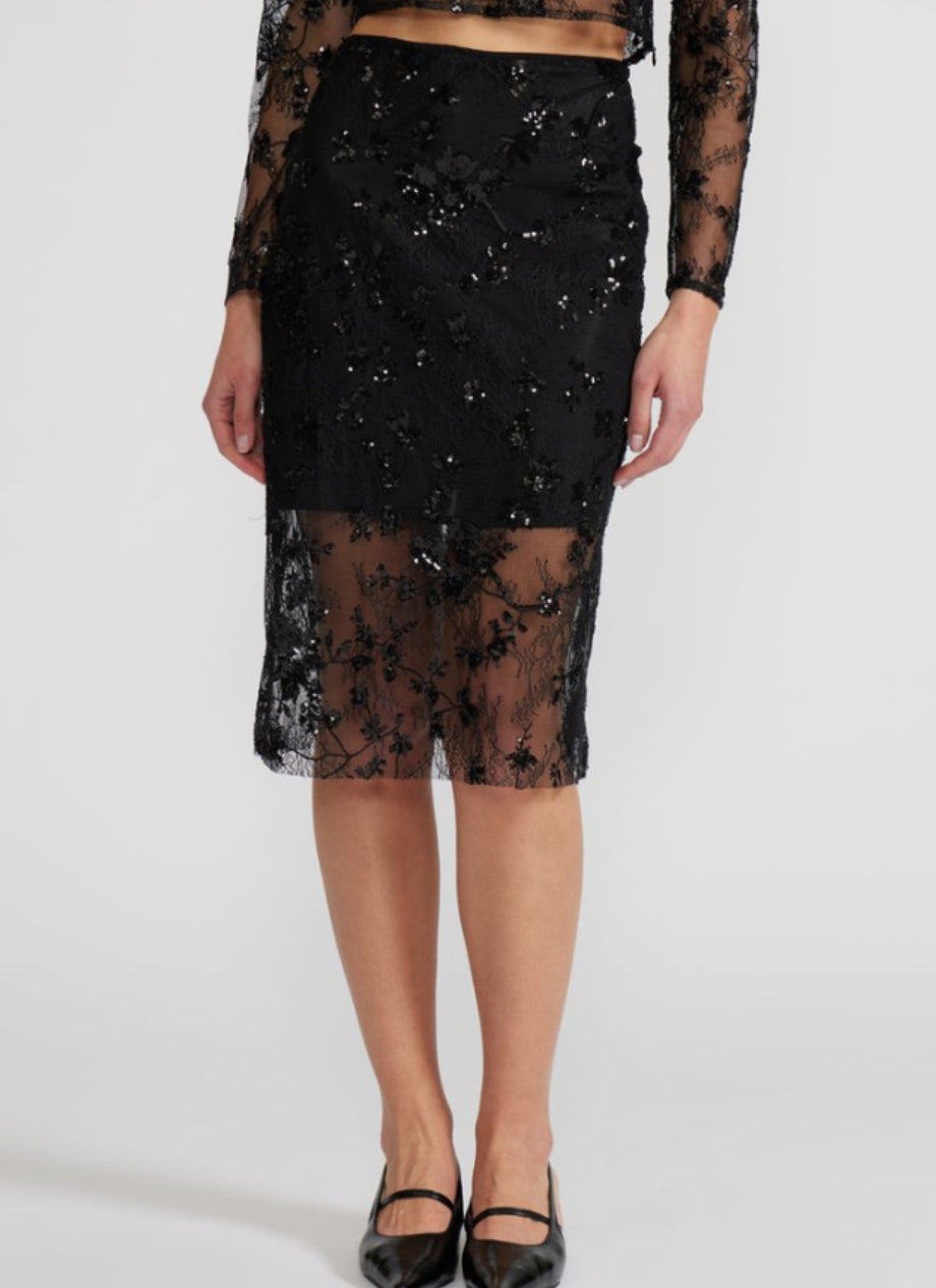 The Helena Skirt features a sheer sequin detailed mesh overskirt and midi length.