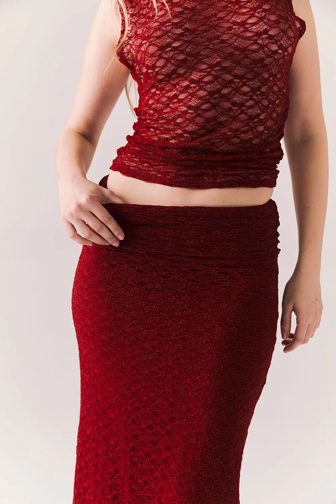 Channeling ’90s inspired elegance, the Pamelaa Cabernet Maxi Skirt features a sleek, straight silhouette paired with subtle lace fabric.