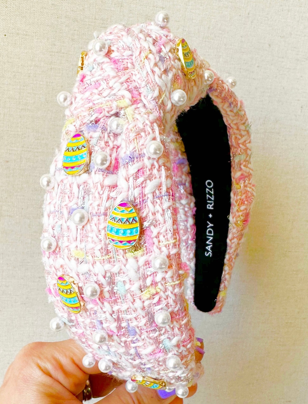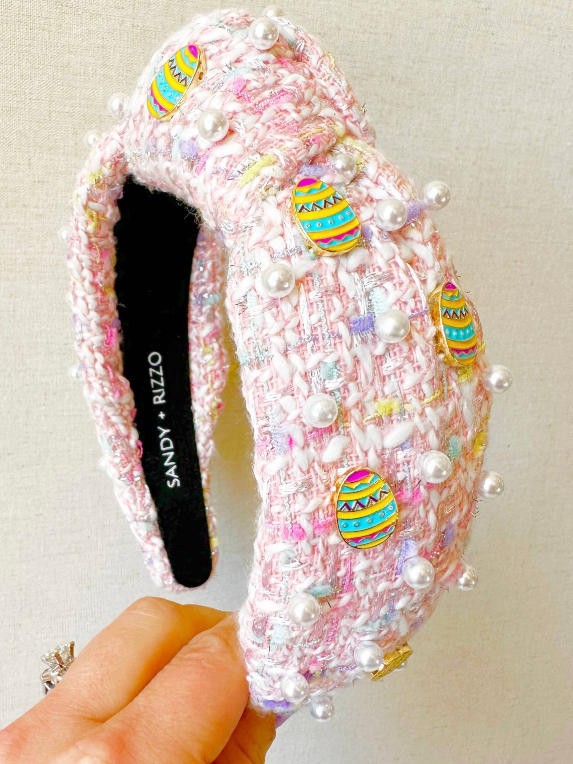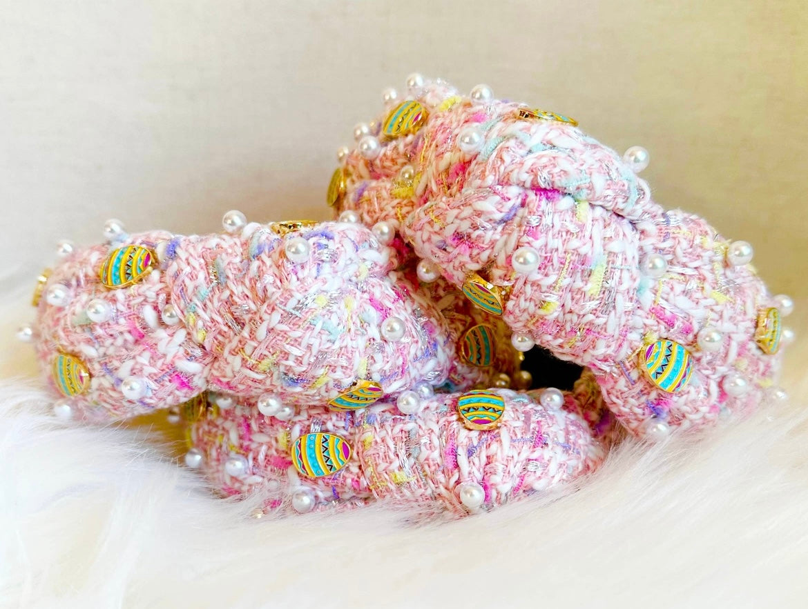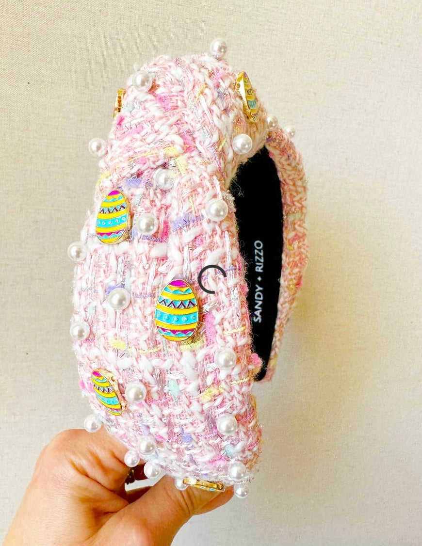 This Easter Headband features tweed fabric with vivid Easter egg embellishments. Bright pink detailing adds a cheerful pop of color. It is sure to bring delight to any holiday celebration.