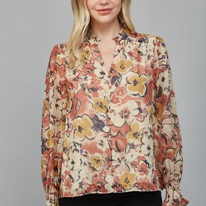 Ruffle Neck Sheer Puffed Sleeve Blouse
