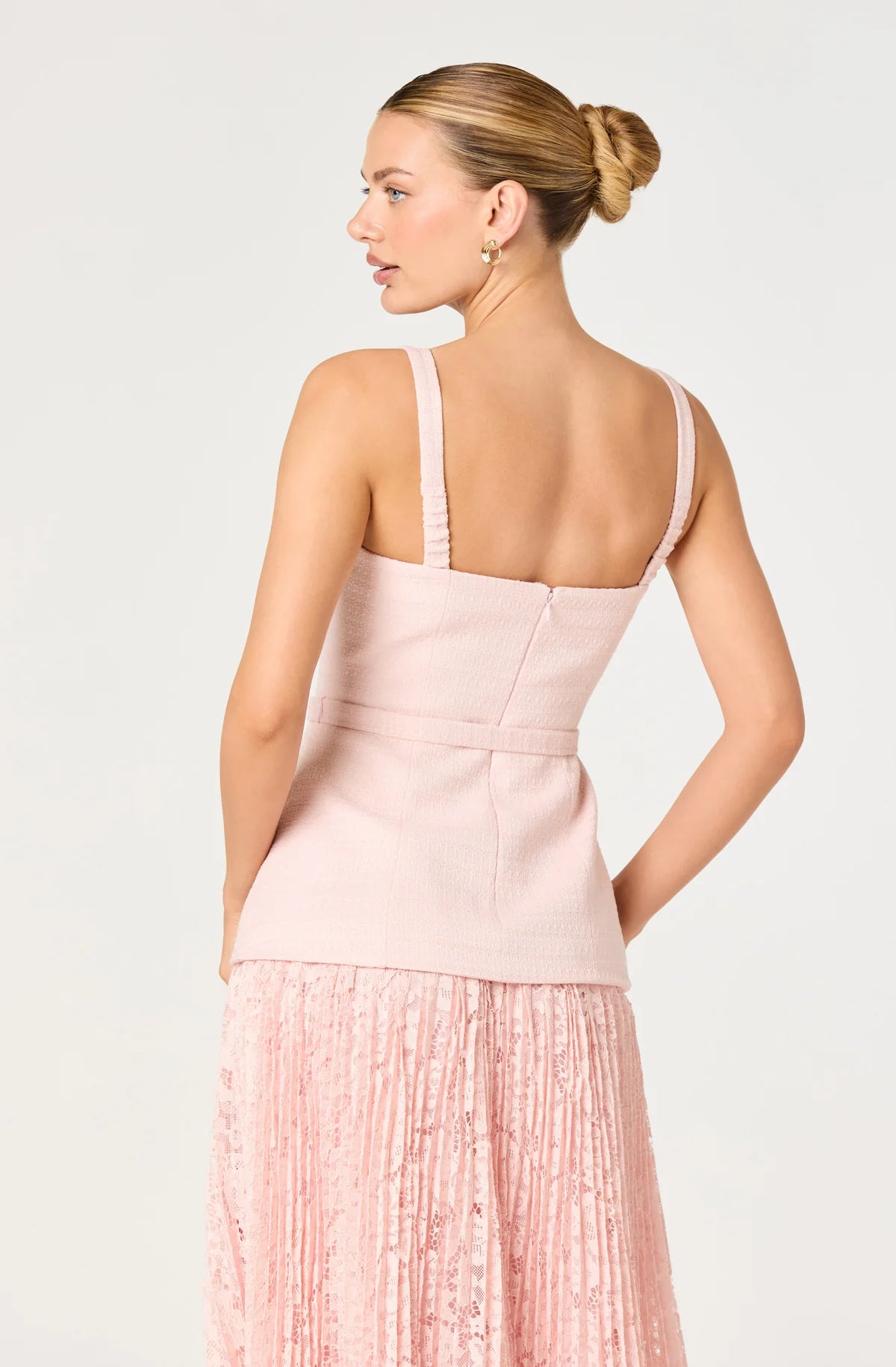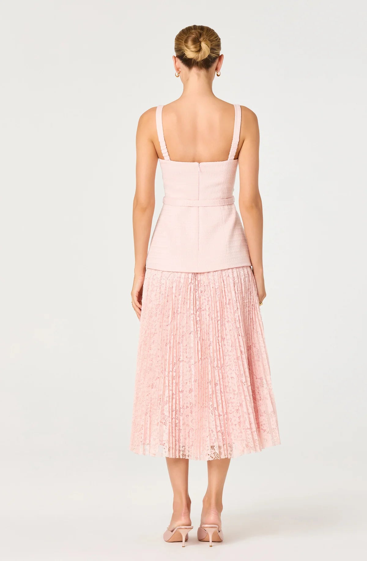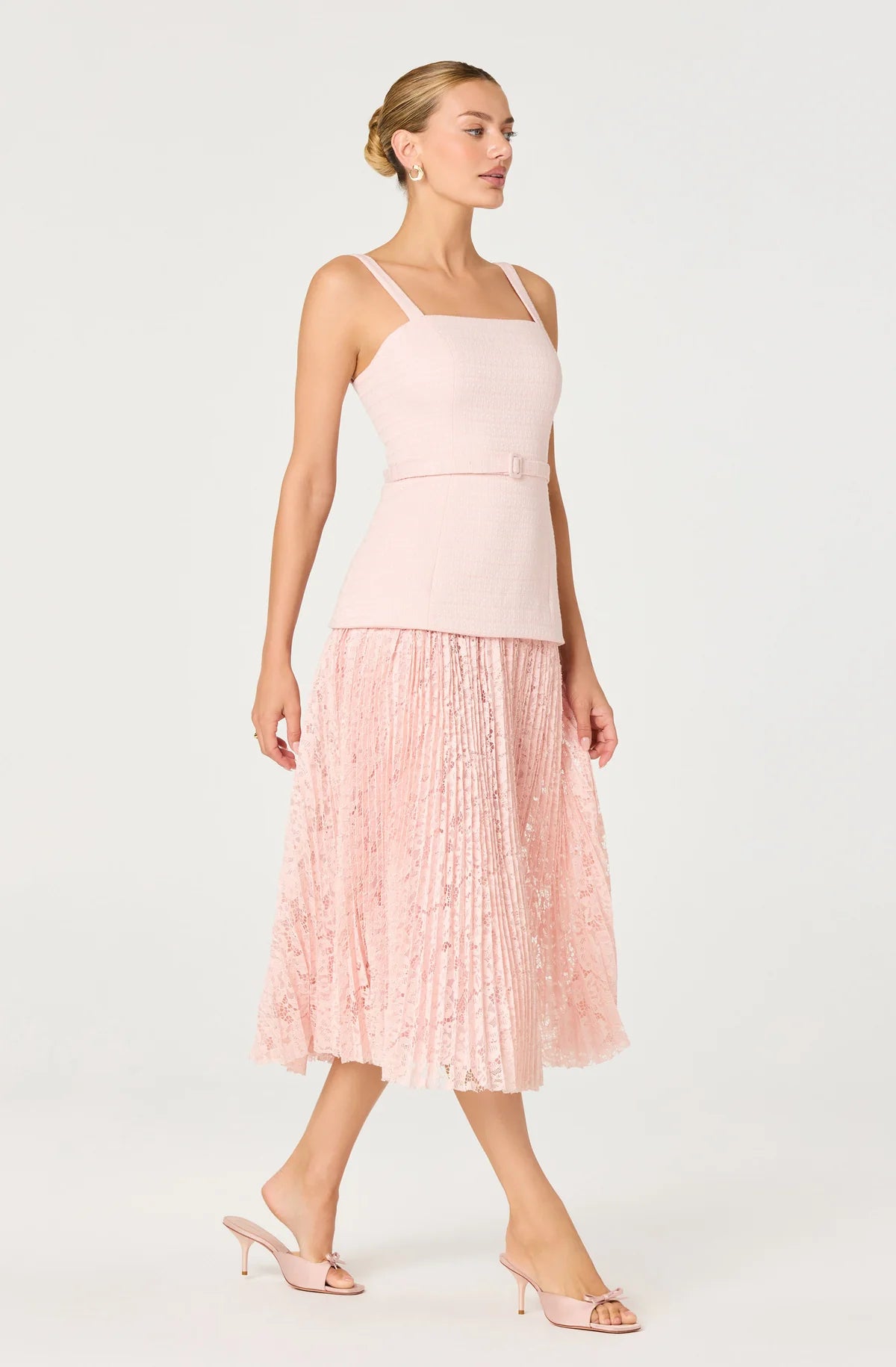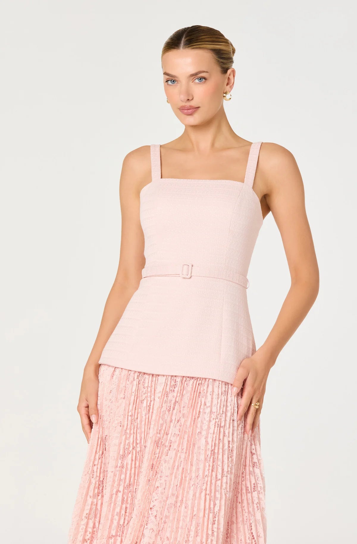 Sophisticated tweed meets romantic lace in this mixed media maxi dress. The structured bodice with princess seams and adjustable belt defines the waist, while the pleated floral lace skirt creates elegant movement.