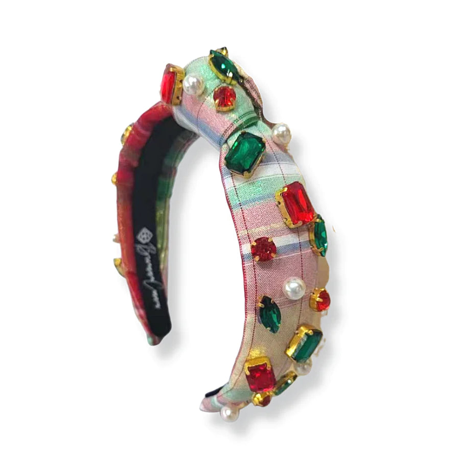 - Metallic White Tartan Plaid Headband with Hand-Sewn Crystals