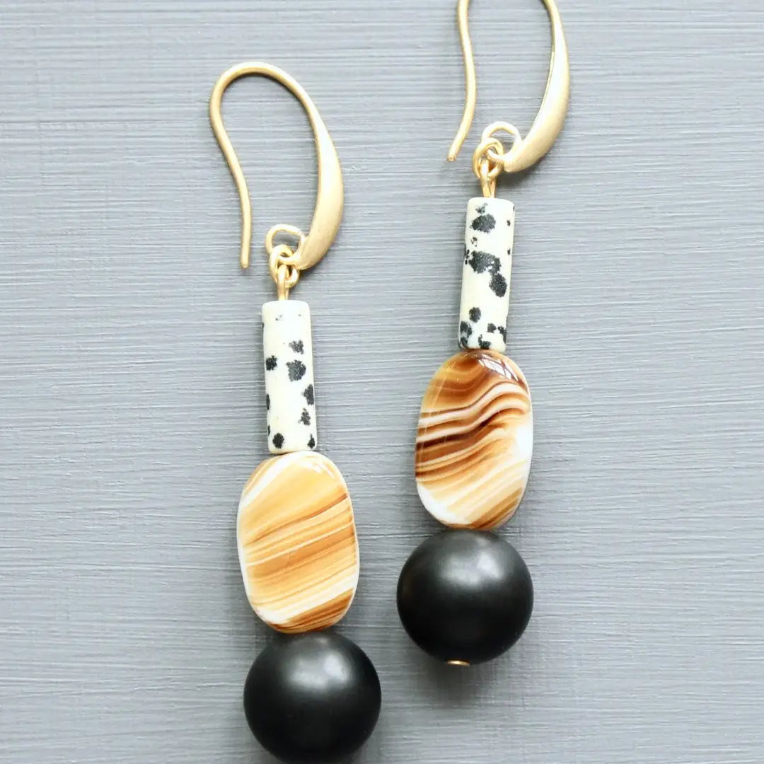 Gold plated brass hook earrings with Dalmatian jasper, vintage matrix, and jet glass. Each earring measures 2.625 inches.