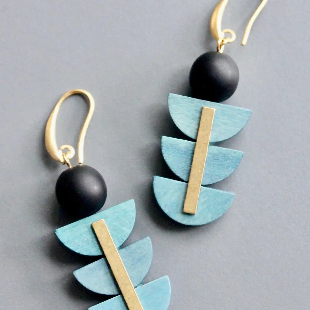 18k gold plated brass hooks with matte jet glass and painted wood. Each half pair weighs .18 oz and measures 2.5 inches.