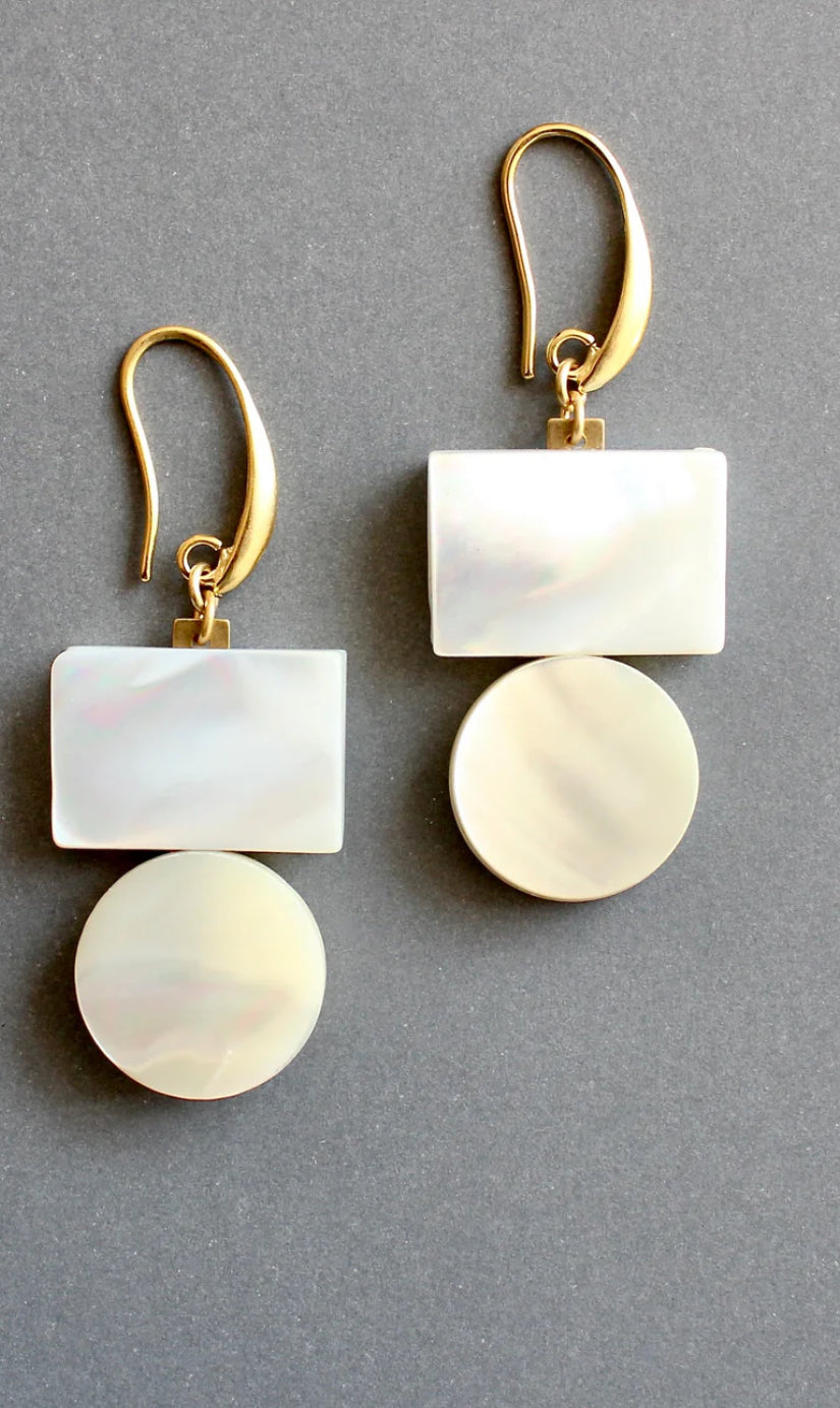 18k gold plated brass earrings with mother-of-pearl. Each earring weighs .225oz and measures 2.25in from top of hook.