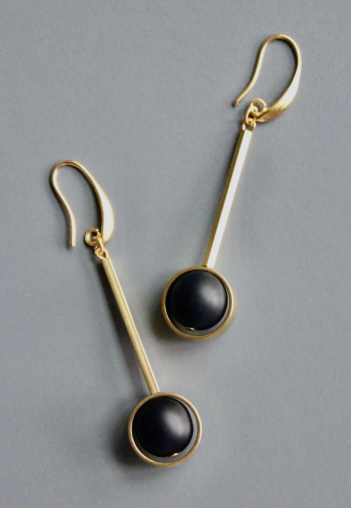 18k gold plated brass hooks with matte jet glass and brass. Each half pair weighs .18 oz and measures 2.625 inches.