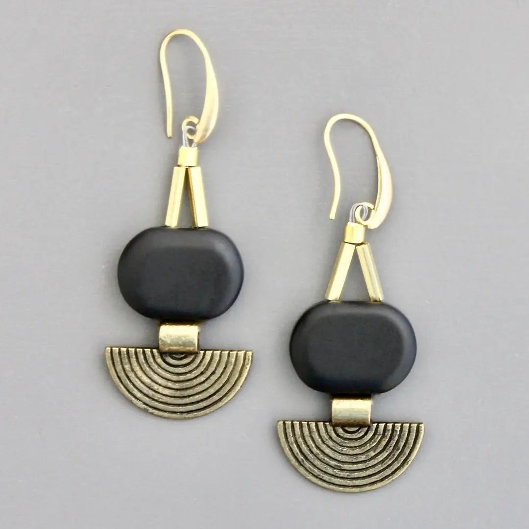 18k gold plated hook earrings with black agate and brass. *Please note new oval version of black agate stone. Each half pair weighs .29 oz and measures 2.6 inches